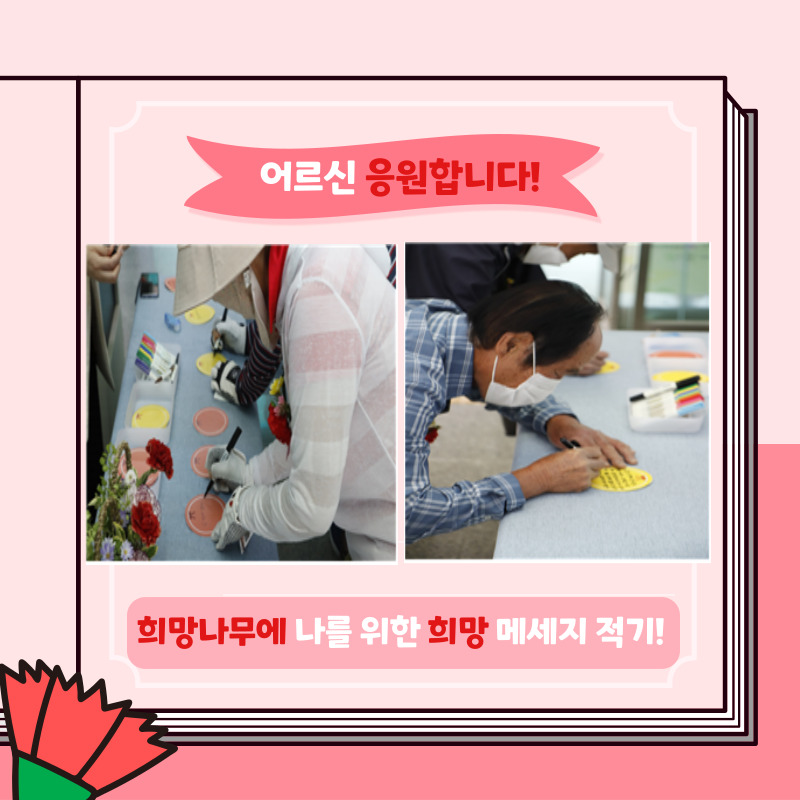 저희 복지관에서는 금일 어버이날 기념 행사를 실시하였습니다! 카네이션 달아드리기, 나를 위한 희망 메세지 적기, 기념품 증정 등 다채로운 행사가 진행되었습니다. 어르신들께서는 건강과 행복, 그리고 코로나19 이전의 일상을 위한 소망을 담아 희망 메세지를 작성하며 뜻 깊은 시간을 보냈다며 즐거워하셨습니다^^!!