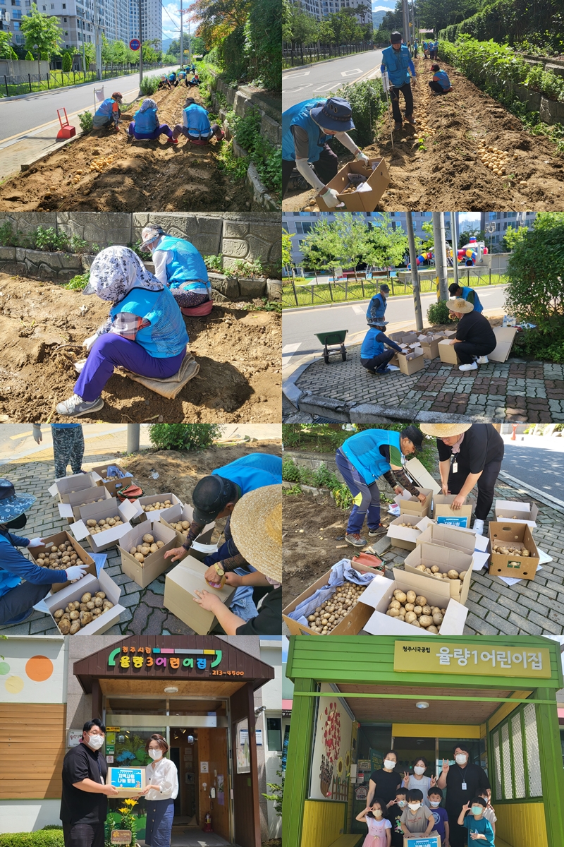 금일 오전 저희 복지관에서는 노인사회활동 지원사업 해피천사 공원지킴이 참여자 어르신들과 함께 관내 텃밭의 감자를 수확하였습니다. 식목일을 하루 앞두었던 지난 4월 4일 공원지킴이 참여자 특화 활동의 일환으로 텃밭에 씨감자를 파종한 후, 지난 3달여간 참여자분들이 틈틈이 잡초 제거, 가지치기 작업 등을 통해 감자를 정성껏 재배해왔습니다. 그동안 저희 복지관과 내덕생활체육공원을 이용해주시는 많은 분들께서 무럭무럭 자라나는 감자싹을 보며 보내주신 관심과 기대에 부응하기라도 하듯 감자가 굵고 실하게 잘 자라주어서 5kg 상자 가득 총 14상자를 수확하는 풍작을 이루어낼 수 있었습니다. 오늘 수확한 감자는 지역 내 어린이집 2곳에 각각 전달하였으며, 공원지킴이 어르신들께서 애정을 담아 키운 감자를 지역사회와 나눌 수 있어 뜻깊은 시간이었습니다.