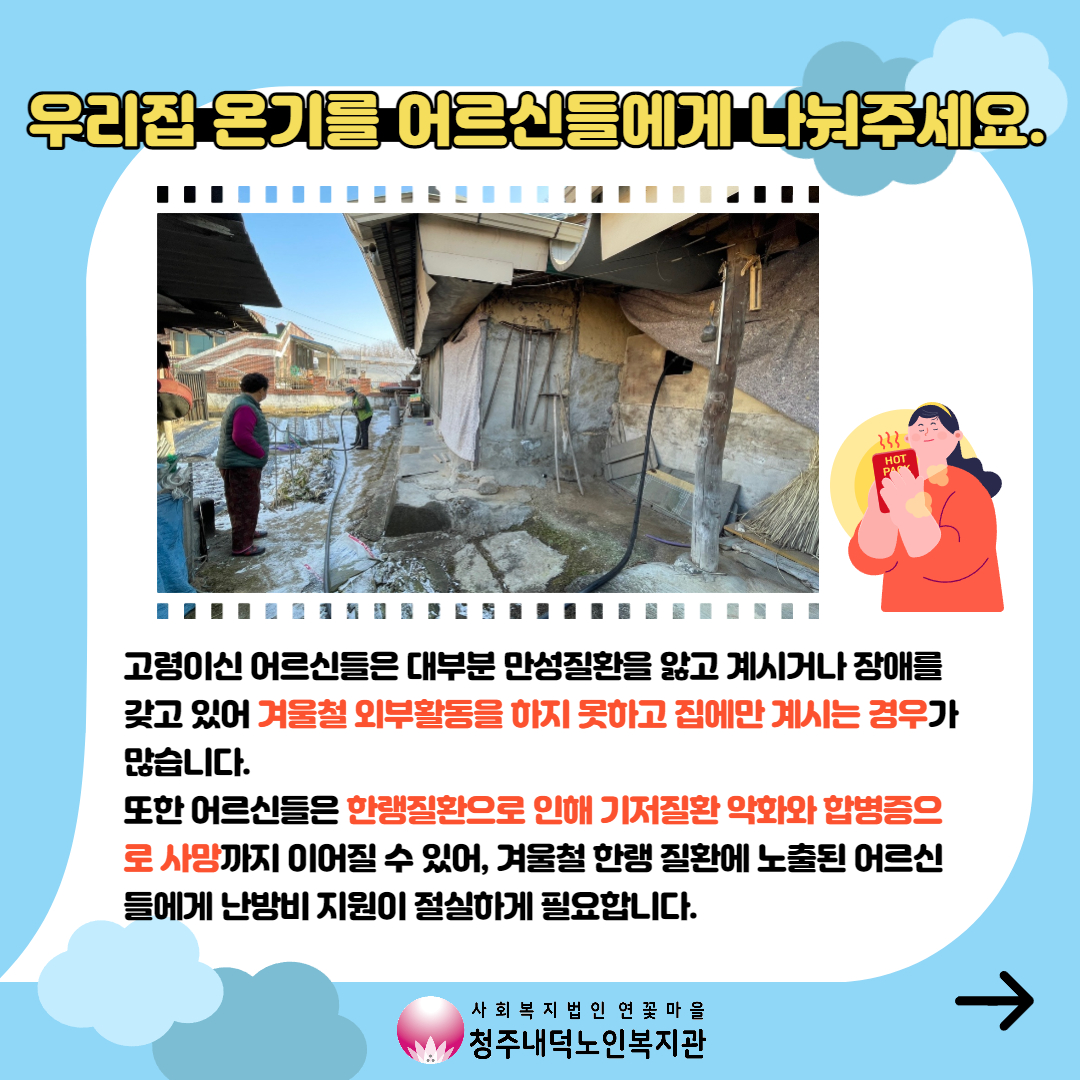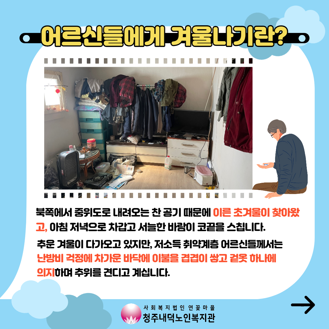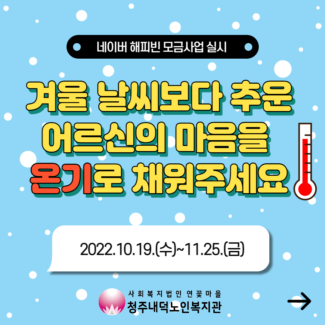 저희 복지관에서는 재가어르신들의 따뜻한 겨울나기를 위한 네이버 해피빈 모금사업을 진행 중입니다! 추운 겨울은, 한랭질환에 노출된 어르신들에게 기저질환 악화와 합병증을 불러일으킬 수 있는 잔인한 계절입니다. 그런데도 경제적 어려움과 치솟는 물가로 인한 난방비 걱정으로 어르신들께서는 냉기 가득한 방에서 하루하루를 보내십니다. 모두가 어렵고 힘든 상황이지만, 냉기 가득한 어르신 댁에 여러분들의 온기를 나누어 주셔서 올겨울만큼은 걱정 없이 따스한 겨울을 보내실 수 있도록 여러분이 함께해주세요!! https://happybean.naver.com/donations/H000000186917?p=p&s=ns 아래 링크를 통해 따뜻한 마음을 나누는 시간을 가져볼까요~!