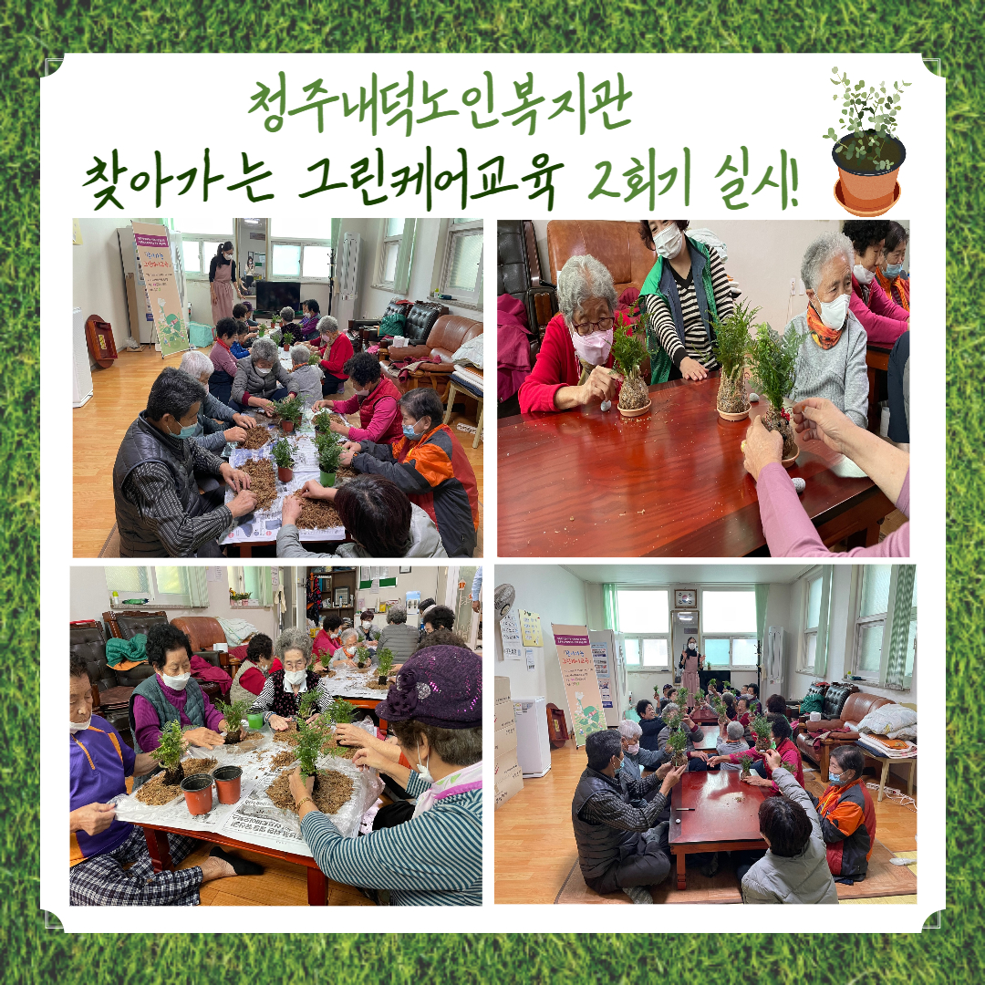저희 복지관에서는 금일 오후 14:00~15:00까지 내수읍 삼일아파트 경로당에서 찾아가는 그린케어교육을 실시하였습니다~! 이번 회기에는 친근한 반려식물인 토피어리 만들기를 통해 외로움과 우울감을 해소할 수 있는 시간이 되었습니다. 어르신들께서는 직접 만든 토피어리에 이름을 지어 예쁘게 꾸몄고, 참여하신 어르신들과 함께 만든 식물에 대해 이야기를 나누는 즐거운 시간이 되어 행복하다고 해주셨습니다. 앞으로도 찾아가는 그린케어교육이 농촌지역 내 어르신들에게 행복하고 즐거운 시간이 되어 정서적으로 긍정적인 영향을 끼칠 수 있도록 노력하겠습니다!