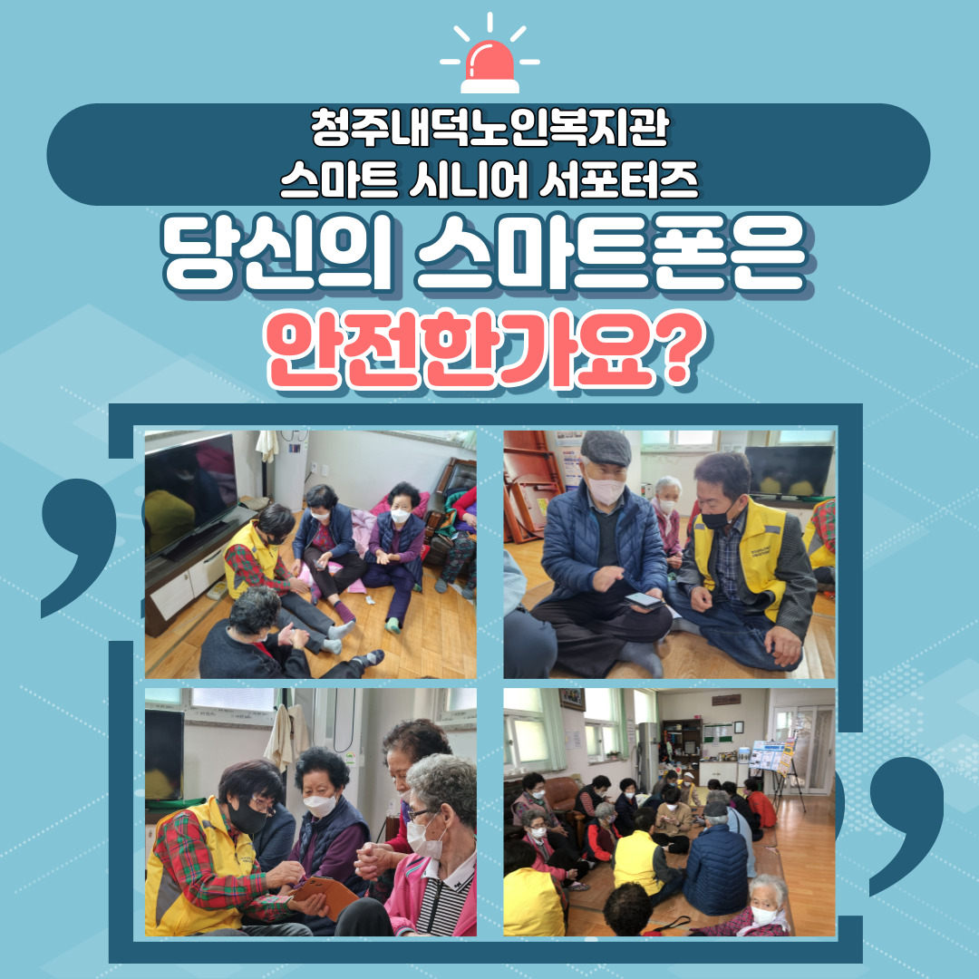 저희 복지관에서는 금일 13:30~15:30 까지 내수읍 삼일아파트 경로당에서 스마트 시니어 서포터즈 봉사단이 찾아가는 스마트폰 상담소 캠페인을 실시하였습니다~! 이번 회기에는 스마트폰 보안을 위한 어플 설명 및 설치와 평소 어려워 하시는 스마트폰 사용 관련하여 도움을 드렸습니다. 또한 무분별하게 설치된 어플 삭제방법, 악성코드 및 바이러스 검사 방법, 보이스피싱으로 부터 예방법 등 어르신이 피해를 보지 않도록 사전에 예방하는 활동을 진행하였습니다. 그 외에도 어르신들께서는 평소 스마트폰을 사용하며 어려움을 겪는 부분을 확인하여 사진보내기, 공유하기 등 다양한 기능들을 사용할 수 있도록 지원하였습니다. 앞으로도 스마트 시니어 서포터즈 활동이 어르신들에게 도움이 될 수 있도록 노력하겠습니다. 많은 관심 바랍니다.