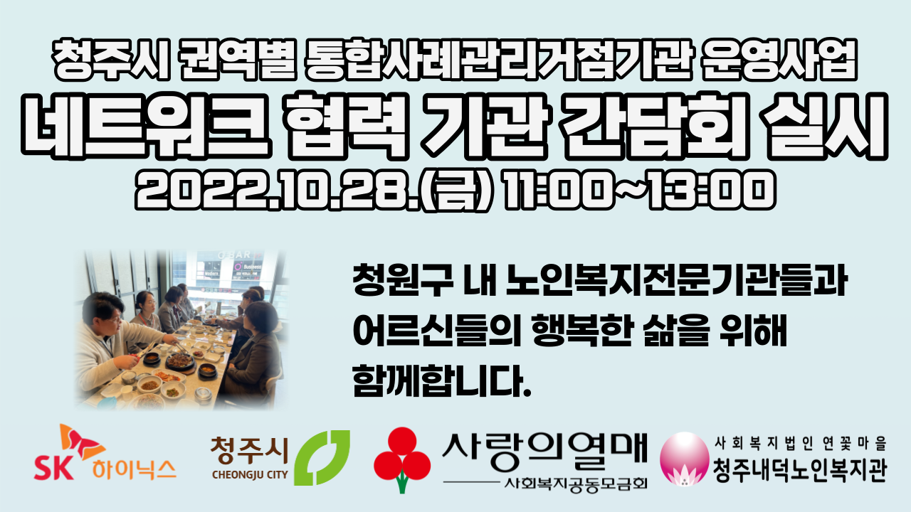 2022년 10월 28일 금요일 오전 11시부터 오후 2시까지 청주내덕노인복지관에서 권역별 통합사례관리거점기관 네트워크 간담회를 실시하였습니다.