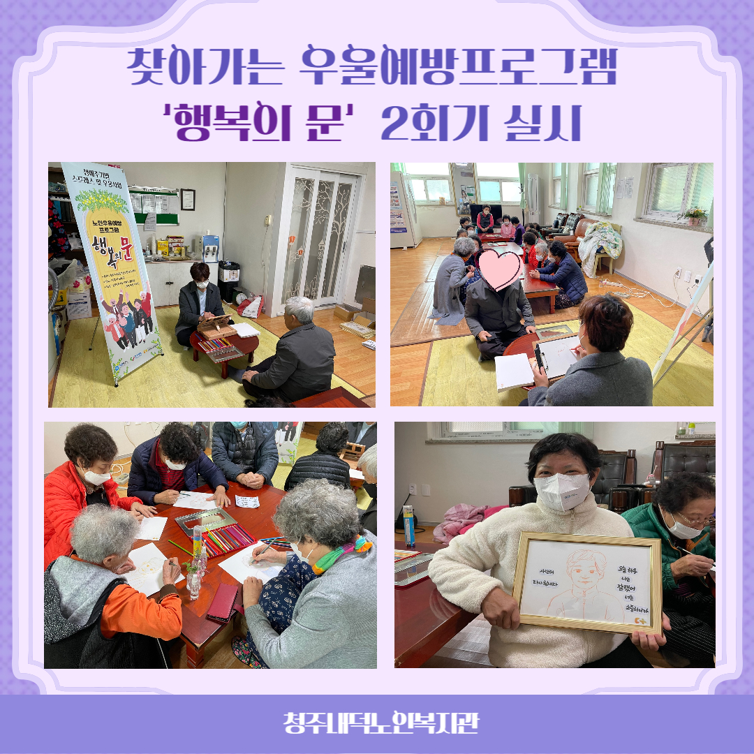 금일 15:00~16:00, 저희 복지관에서는 내수 삼일아파트 경로당에서 청주시청원정신건강복지센터와 연계하여 찾아가는 우울예방프로그램 '행복의 문'을 실시하였습니다.