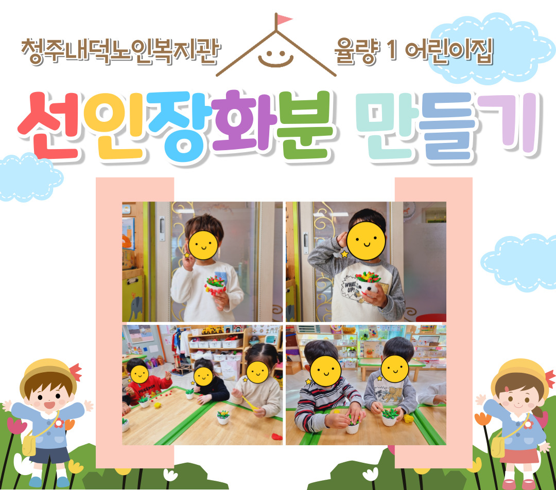 저희 복지관에서는 지난 11월 4일(금) 13:30~15:00, 노인자원봉사활성화지원사업 '공예누리봉사단'이 직접 만든 선인장 화분을 청주시 청원구 소재 3개의 어린이집에 지원하였습니다. 3개의 어린이집 중 율량 1어린이집의 아동들이 선인장 화분 꾸미기 활동 모습입니다.