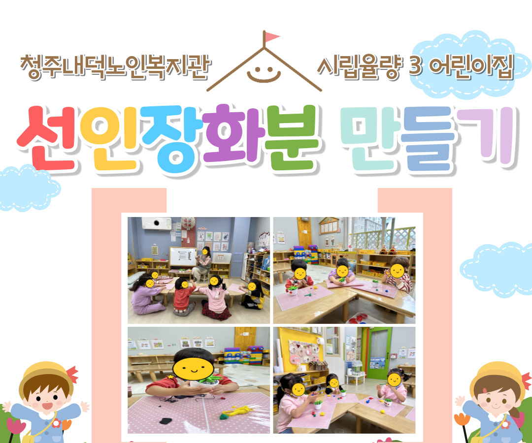 저희 복지관에서는 지난 11월 4일(금) 13:30~15:00, 노인자원봉사활성화지원사업 '공예누리봉사단'이 직접 만든 선인장 화분을 청주시 청원구 소재 3개의 어린이집에 지원하였습니다. 3개의 어린이집 중 시립 율량 3어린이집의 아동들의 선인장 화분 꾸미기 활동 모습입니다.