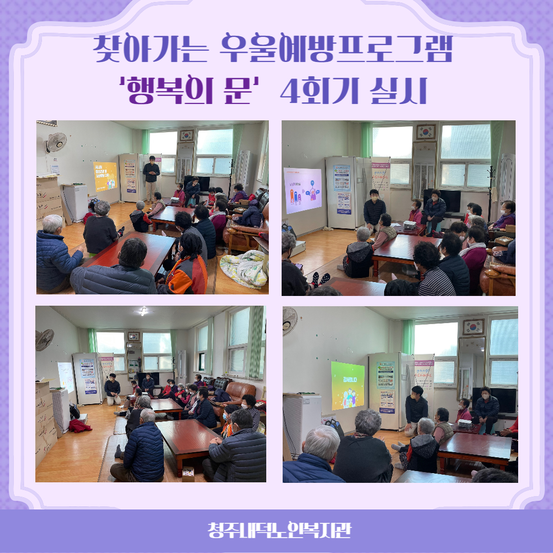 금일 15:00~16:00, 저희 복지관에서는 내수 삼일아파트 경로당에서 청주시청원정신건강복지센터와 연계하여 찾아가는 우울예방프로그램 '행복의 문'을 실시하였습니다.