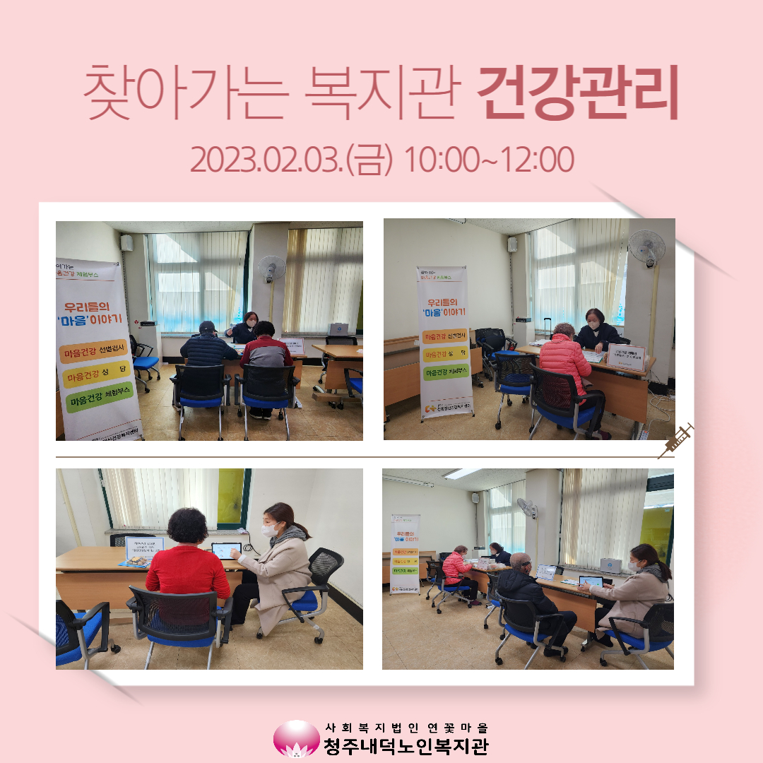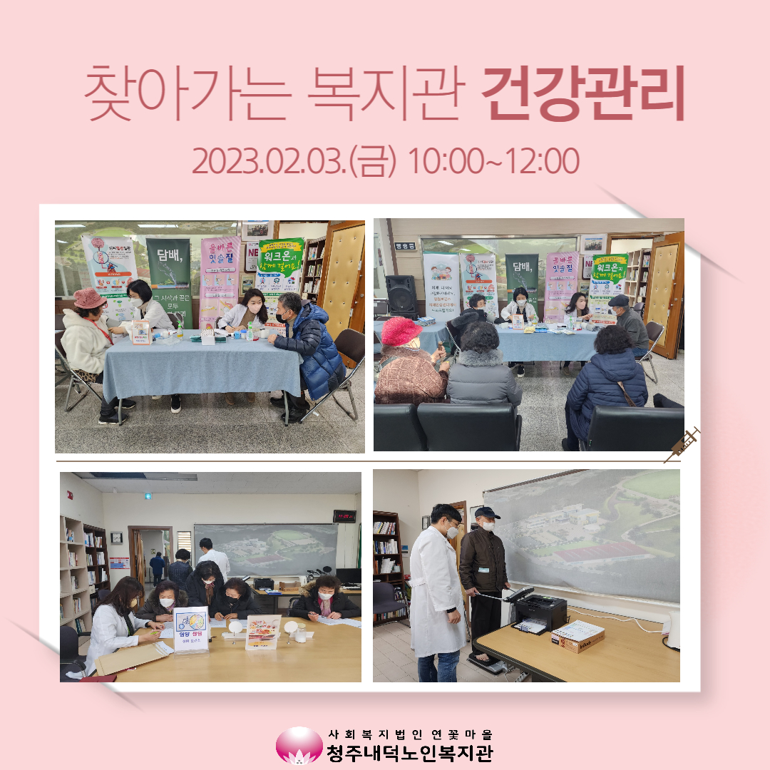 2023년 2월 3일(금) 10:00~12:00 복지관 내 1층 로비 및 방송실, 상담실에서 청원보건소와 함께하는 건강생활지원사업 ‘찾아가는 복지관 건강관리’를 진행 하였습니다.