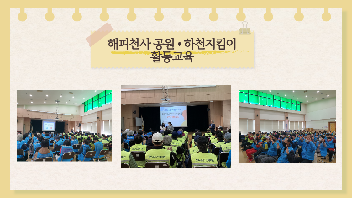 2023년 올 한해도 노인사회활동 지원사업 해피천사 공원지킴이, 하천지킴이 어르신들께서 안전하고 책임감있는 활동에 참여하실 수 있도록 꾸준히 교육을 지원하겠습니다~!