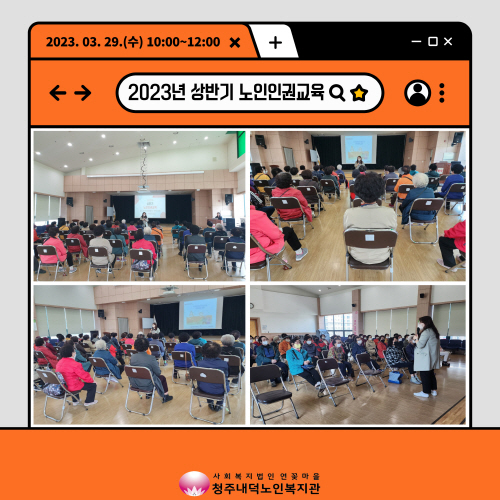 청주내덕노인복지관에서는 3월29일(수) 10시~12시까지 노인권익증진을 위한 2023년 상반기 노인인권교육을 실시하였습니다.