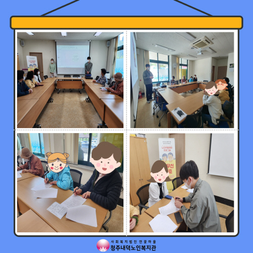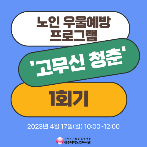 2023년 4월 17일(월) 10:00~12:00 청주시청원정신건강복지센터와 연계하여 노인 우울예방 프로그램 "고무신청춘" 1회기가 진행되었습니다.