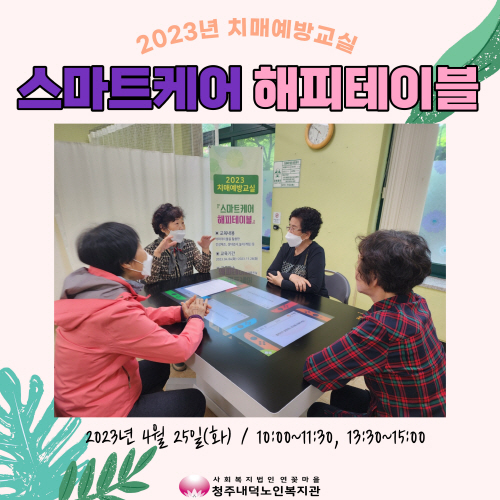 청주내덕노인복지관에서는 2023년 4월 25일(화) 오전(10:000~11:30)과 오후(13:30~15:00) 그룹별 치매예방교실 스마트케어 해피테이블 마지막 회기가 진행되었습니다.