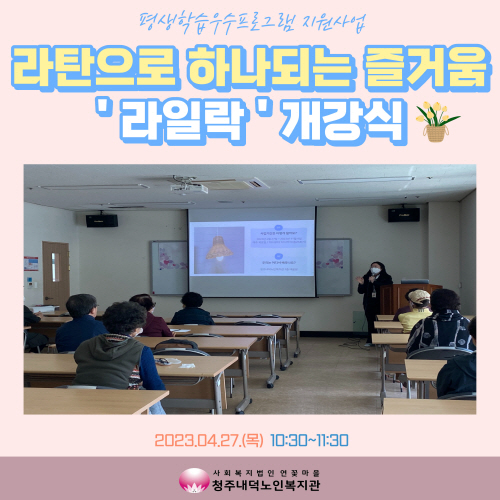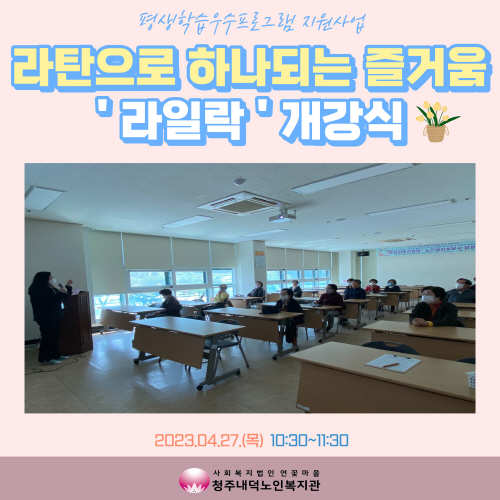 2023년 4월 27일(목) 10:30~11:30 청주내덕노인복지관 2층 배움방에서 2023년 평생학습우수프로그램지원사업으로 라탄으로 하나되는 즐거움 '라일락' 개강식이 진행되었습니다.