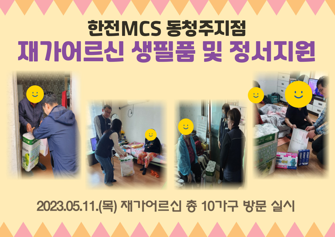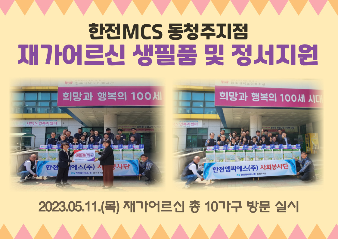 청주내덕노인복지관은 한전MCS 동청주지점과 함께 가정의 달을 맞이하여 30만원 상당의 생필품 지원 “어르신 삶을 풍요롭게! 따뜻한 마음 전달!” 사업을 5월 11일 목요일 진행했습니다. 정서적, 경제적으로 어려움을 겪고 소외된 어르신들에게 적지만 큰 도움이 될 수 있도록 한전엠씨에스 동청주지점 직원들이 고른 생활필수품을 직접 가정에 전달하며 따뜻한 마음도 함께 전했습니다.