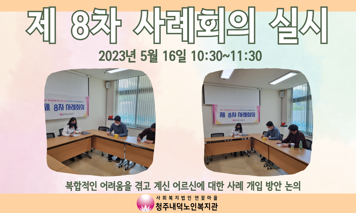 청주내덕노인복지관에서는 5월 16일 화요일 10시 30분부터 11시 30분까지 복지관 1층 상담실에서 제8차 사례회의를 진행하였습니다. 복합적인 어려움을 겪고 있는 어르신에게 어떤 자원을 연계해야 어르신이 더 행복하게 생활 하실 수 있을지에 대해 논의하였습니다. 어떤 도움을 드릴 수 있을지에 대해 논의하여 어르신 주변의 자원과 복지관이 가지고 있는 자원들을 활용하여 어르신이 지역사회에서 잘 생활하실 수 있도록 하겠습니다!