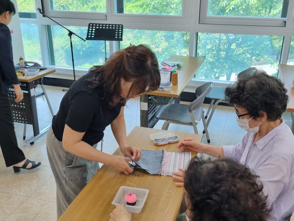 ▲[사진2] '청바지로 만드는 파우치'-청주내덕노인복지관 2층 으뜸방 청바지 자투리 제거를 도와주는 강사 모습