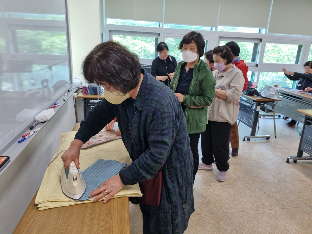 ▲[사진1] '청바지로 만드는 손목 가방'-청주내덕노인복지관 2층 으뜸방 바느질 후 다림질하기와 기다리는 참여자의 모습