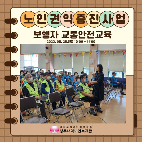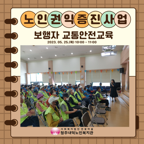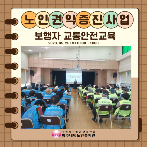 청주내덕노인복지관에서는 5월25일(목) 10:00~11:00 1층 강당에서 보행자 교통안전교육을 실시하였습니다.