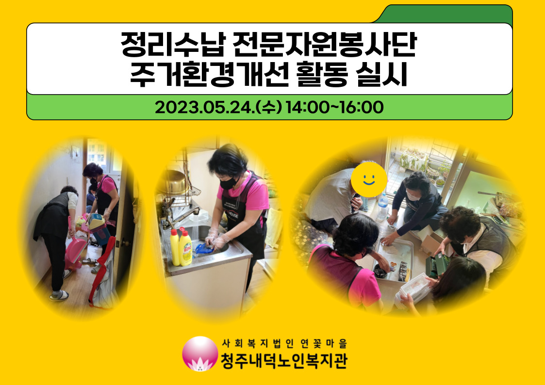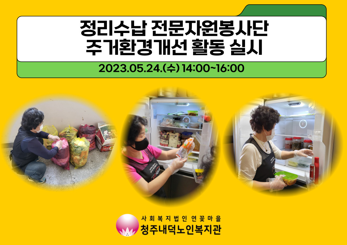 지난 5/24(수) 청주내덕노인복지관에서는 정리수납 전문자원봉사단 선생님들과 함께 독거어르신 가정의 주거환경 개선 활동을 실시하였습니다. 퇴원 후 기력이 없어 외출도 하지 못하고, 간단한 일상생활조차도 수행하기 어려운 수요자 어르신을 위해 자원봉사단 선생님들이 냉장고 속의 곰팡이 핀 음식물, 페트병과 같은 생활 쓰레기 등을 정리해주셨습니다. 그리고 어지럽게 뒤섞여있는 각종 약상자와 약봉지들을 정리하시면서 어르신께 간단한 정리·수납 방법도 알려드렸습니다.