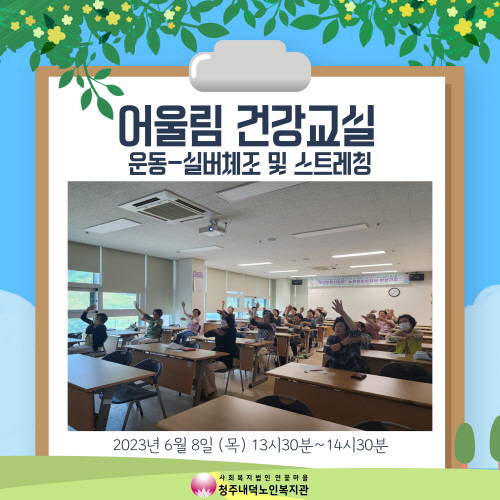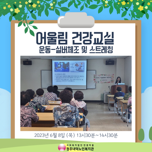 6월8일(목) 13:30~14:30에 청주내덕노인복지관에서는 건강생활지원사업의 일환으로 어울림 건강교실 4회기가 진행되었습니다.