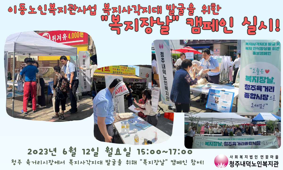청주내덕노인복지관은 6/12일(월) 15시~17시까지 육거리종합시장 멀티지원센터 앞 광장에서 “복지장날” 캠페인 활동에 참여하였습니다. 이번 복지장날 캠페인은 복지 사각지대에 대한 지역주민의 관심을 고취하고 복지인식을 향상시키기 위한 취지에서 청주시 내 다양한 복지, 보건, 의료기관 9곳(청주내덕노인복지관, 청주시독거노인통합지원센터, 청주서원노인복지관, 충청북도노인보호전문기관, 청주시주거복지센터, 청주산남노인복지센터, 청주노인복지센터, 뿌리병원, 필한방병원)이 함께하였습니다. 앞으로도 청주내덕노인복지관은 다양한 지역 캠페인에 참여하여 찾아가는 복지상담 프로그램을 통해 위기 및 취약가구 어르신을 발굴·지원할 수 있도록 노력하겠습니다~!