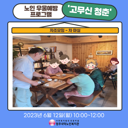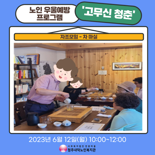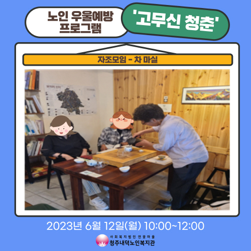 청주내덕노인복지관에서는 6월12일(월) 10시~12시 청주시청원정신건강복지센터와 함께 노인우울예방프로그램 고무신청춘 자조모임을 진행하였습니다.