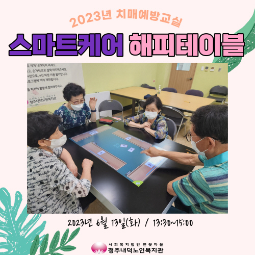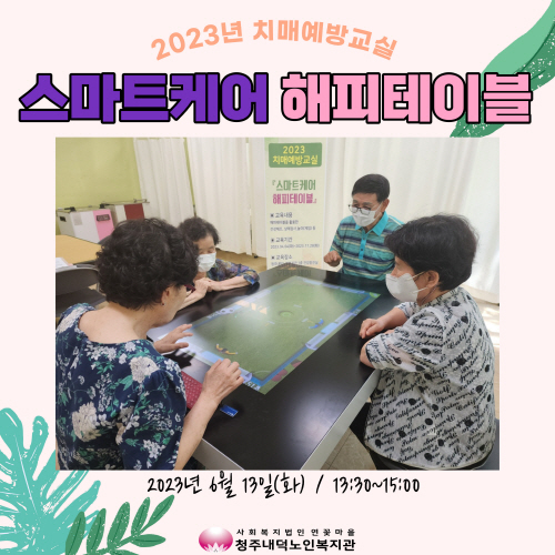 청주내덕노인복지관에서는 2023년 6월13일(화)부터 치매예방교실 스마트케어 해피테이블 교실 6월 참여자들의 프로그램이 진행되고 있습니다.