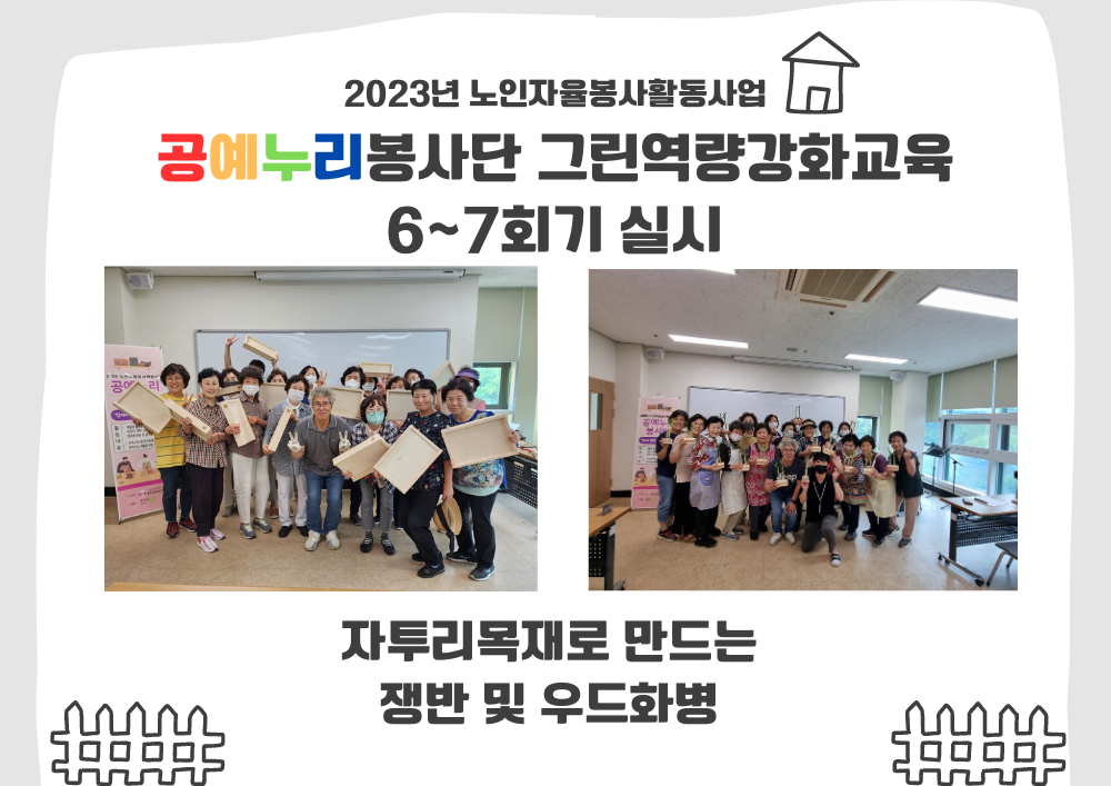 청주내덕노인복지관에서 진행하는 2023년 노인자율봉사활동사업 공예누리봉사단 그린역량강화교육이 5월 30일(화), 6월 13일(화) 6~7회기가 진행되었습니다. 공예누리봉사단은 버려지는 소재를 활용한 '업사이클링'을 통해 다시 사용 가능한 작품을 만들어 내는 활동을 하고 있습니다. 이번 6회기, 7회기 활동에서는 '자투리목재로 만드는 쟁반&우드 화병'를 진행하였습니다. 앞으로 공예누리봉사단은 '업사이클링'을 통해 다양한 작품을 만들어 나갈 예정이며, 올해 체험부스를 운영 예정입니다.