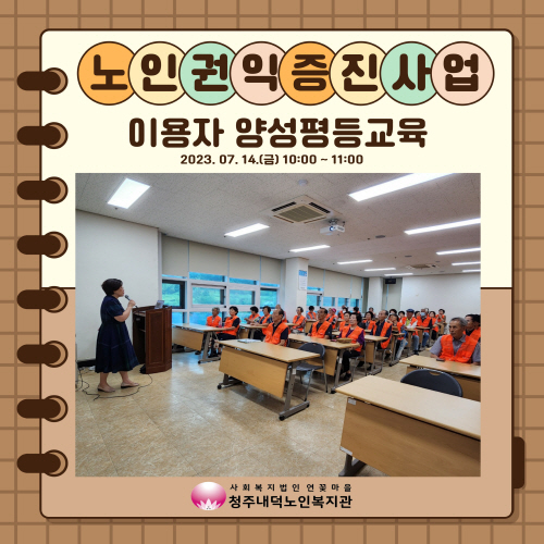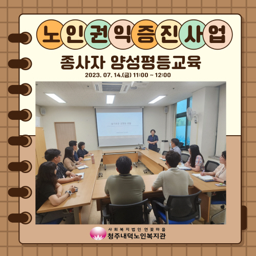 청주내덕노인복지관에서는 7월14일(화) 10:00~12:00 이용자 및 종사자를 대상으로 양성평등교육이 진행되었습니다.