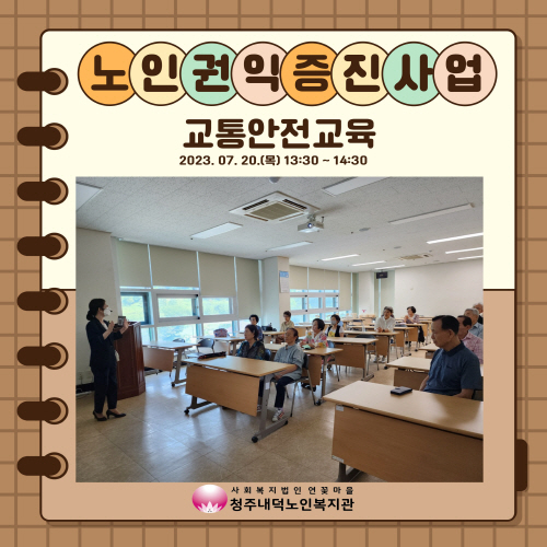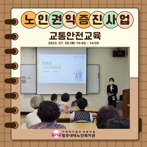청주내덕노인복지관에서는 7월20일(목) 오후 1시30분~2시30분 2층 배움방에서 교통안전교육을 진행하였습니다.