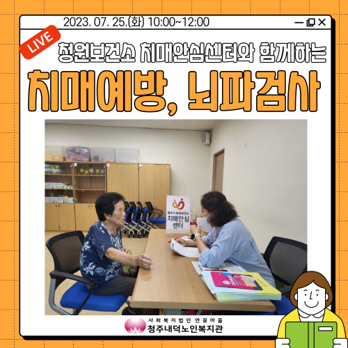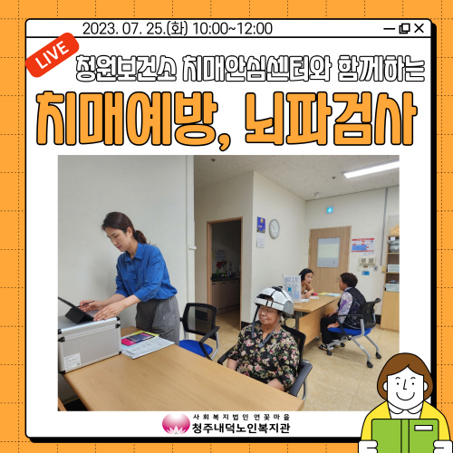청주내덕노인복지관에서는 2023년 7월 25일(화) 10:00~12:00 청원보건소 치매안심센터와 함께 치매예방을 위한 뇌파검사가 1층 상담실에서 진행되었습니다.