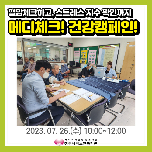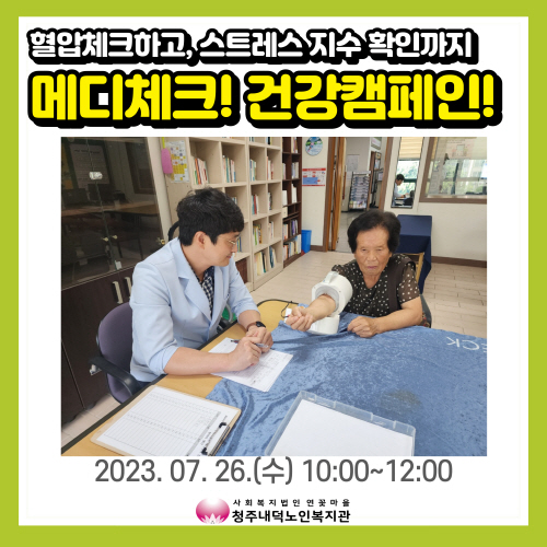 청주내덕노인복지관에서는 2023년 7월26일(수) 10:00~12:00 한국건강관리협회 충북세종지부와 함께 메디체크! 건강캠페인이 1층 상담실에서 진행되었습니다.