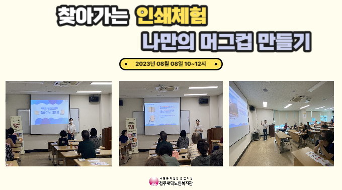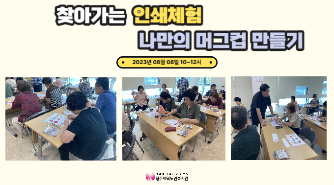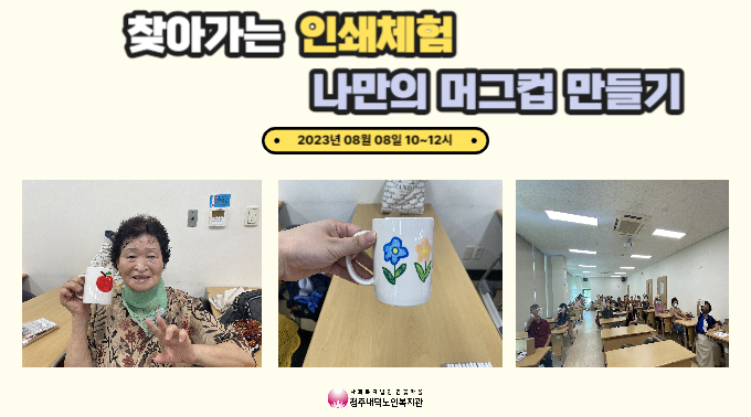 찾아가는 인쇄체험 나만의 머그컵 만들기가 진행되었습니다! 이번 방학 특강은 청주고인쇄박물관 근현대인쇄전시관에서 직접 오셔서 체험을 진행해주셨습니다. 먼저 체험을 진행해주시는 청주고인쇄박물관, 근현대인쇄전시관, 직지에 대해 설명을 듣고 머그컵을 만드는 방법에 대한 설명을 해주셨습니다. 이번 체험은 전사기법을 활용하여 전사지에 원하는 그림을 그린 후 열을 이용하여 머그컵에 그림을 넣는 방식으로 진행되어 며칠동안 기다릴 필요 없이 열이 식히면 바로 사용할 수 있도록 진행되었습니다. 선생님들의 친절한 설명으로 참여자분들은 본인만의 그림을 열심히 고민하시고 그리시면서 머그컵을 만들으셨습니다. 다 완성된 머그컵을 보시고 참여자분들은 본인의 그림이 머그컵에 들어간 것에 신기해 하셨습니다. 또한, "오랜만에 그림 그리기를 해보니 학창시절이 떠올라요", "직접 체험을 할 수 있어 너무 즐거웠어요" 등의 소감을 말씀해주시며 만족해하셨습니다. 복지관 이용자 분들이 다양한 교육 및 체험을 할 수 있도록 노력하겠습니다.