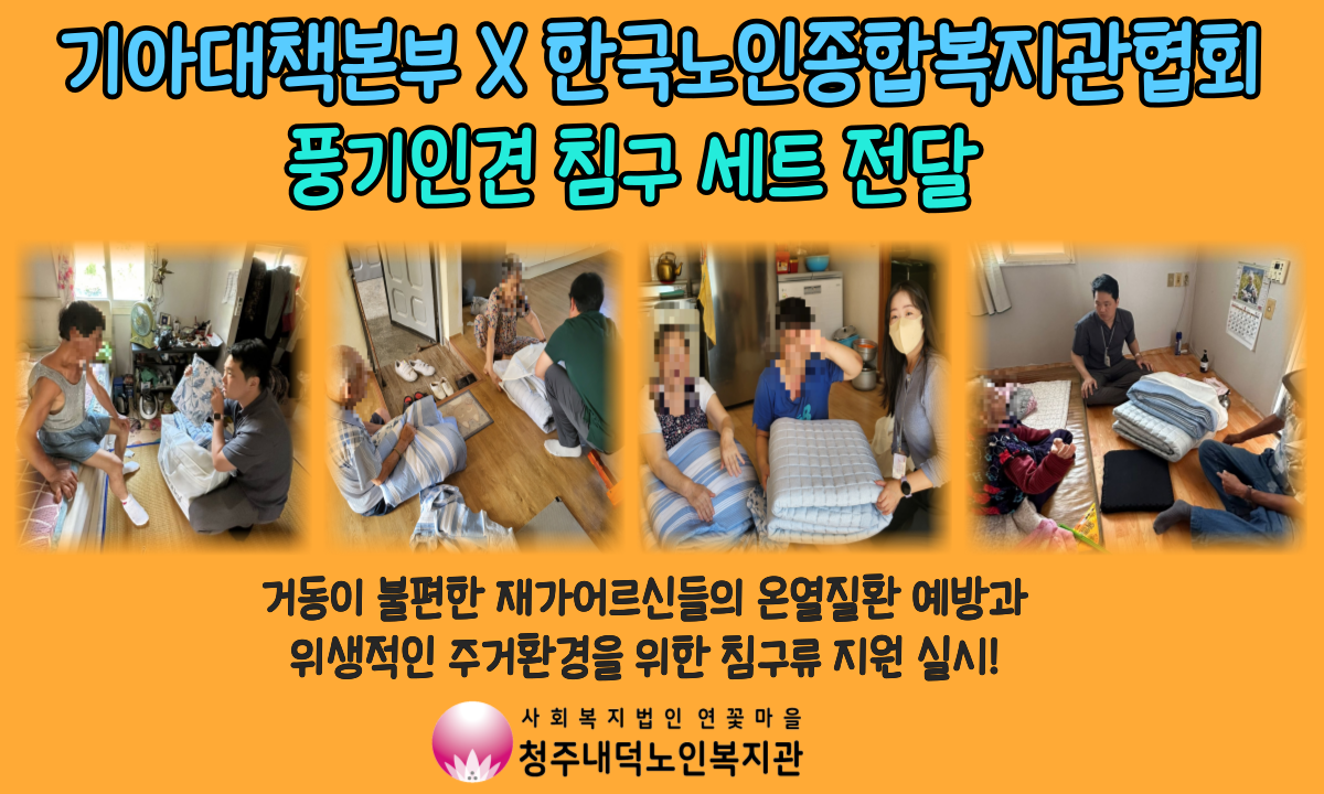 청주내덕노인복지관에서는 8/25(금) 기아대책본부와 한국노인종합복지관협회에서 지원하는 풍기인견 침구세트를 재가어르신 10분에게 지원하였습니다. 기력이 없어 집 안에서도 누워 계시는 시간이 대부분인 어르신, 지적장애를 가진 자녀와 함께 생활하며 청결한 주거환경을 유지하기 어려웠던 어르신, 투석을 매주 받으시며 침구가 핏자국으로 엉망이었던 어르신 등, 거동이 불편하거나 자녀들의 돌봄을 받기 어려운 재가어르신들께 인견 소재의 침구 세트를 전달해드림으로써 쾌적한 주거환경을 유지하실 수 있도록 지원하였습니다. 앞으로도 청주내덕노인복지관은 지역사회의 자원을 꼭 필요한 어르신들께 잘 연계해드릴 수 있도록 노력하겠습니다~!