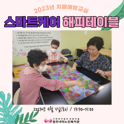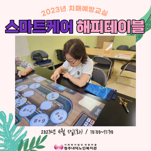 청주내덕노인복지관에서는 2023년 9월5일(화) 치매예방교실 스마트케어 해피테이블이 오전(10:00~11:30)과 오후(13:30~15:00) 그룹별 1회기가 진행되었습니다.
