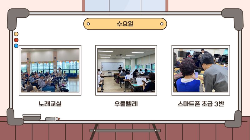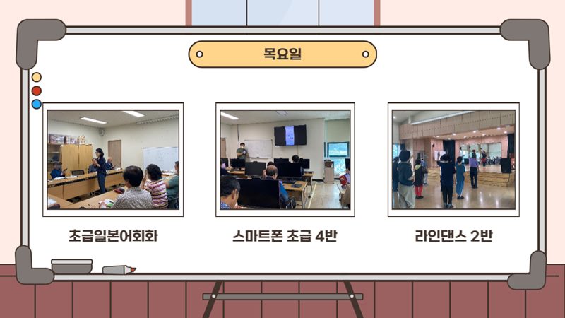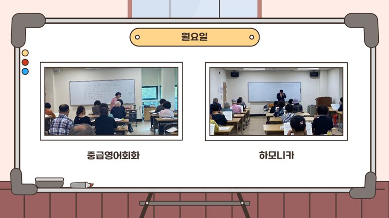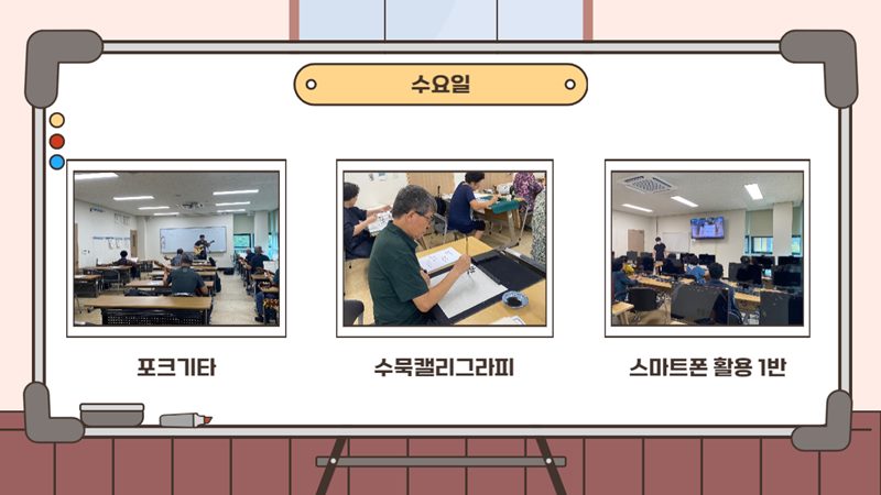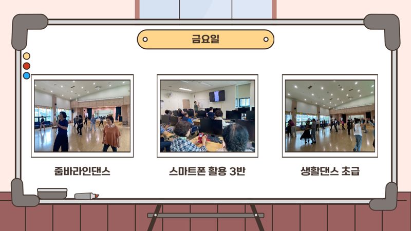 더위를 피해 잠시 쉬어갔던 늘벗골 문화교실이 9월 11일(월)부터 하반기 수업이 개강되었습니다! 쉬는 동안 무료하셨다고 수업을 같이 듣던 지인들과 강사님들을 만나 반갑에 인사를 나누며 얘기를 나누시는 모습에 복지관의 분위기가 더욱 활기차졌습니다! 남은 하반기 수업들도 어르신들이 즐겁게 즐기실수 있도록 노력하겠습니다!