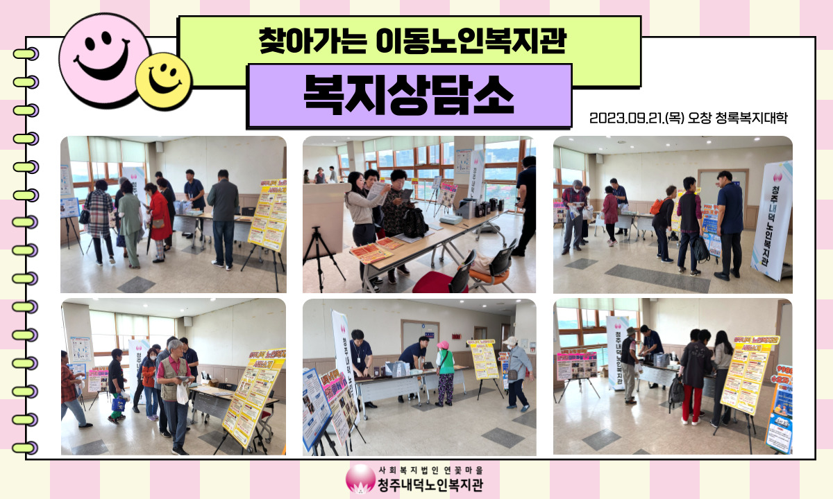 9/21(목) 청주내덕노인복지관에서는 청록복지대학이 열리는 오창 목령종합사회복지관에서 찾아가는 이동노인복지관 복지상담소 프로그램을 진행하였습니다. 어르신 200여명을 대상으로 내덕노인복지관에서 진행하는 다양한 문화·여가 프로그램과 사회참여 활동에 관심을 보이는 어르신들을 위한 자원봉사, 노인일자리 사업에 대해 소개해드렸습니다. 혹시라도 지원이 필요한 위기 및 취약 어르신을 알고 계신 경우에는 복지관으로 연락주시거나, 도움이 필요한 어르신이 계시면 언제든 복지관으로 찾아와주시기를 요청드렸습니다. 앞으로도 청주내덕노인복지관에서는 청원구 농촌지역 어르신들의 복지 체감도 향상을 위해 매월 직접 찾아가는 복지상담소 활동을 펼칠 예정이니, 많은 관심과 참여 부탁드리겠습니다~!