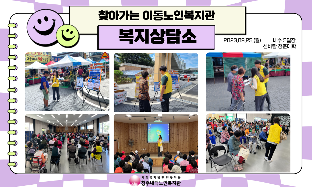 9/25(월) 청주내덕노인복지관에서는 내수 5일장이 열리는 장터와 내수주민자치센터에서 찾아가는 이동노인복지관 복지상담소 프로그램을 진행하였습니다. 시장 곳곳에서 추석맞이 준비가 분주한 가운데, 명절에도 찾아오는 가족 없이 외롭게 지내는 지역 어르신들을 주위에서 발견하게 된다면 언제든지 복지관으로 연락주실 수 있도록 위기 및 취약노인지원사업에 대해 안내드렸습니다. 그리고 200여 명의 어르신들이 모여 계신 신바람 청춘대학(내수주민자치센터)를 방문하여 복지관에서 진행하는 다양한 여가·문화 프로그램과 복지사업들에 대해 소개하는 시간을 갖고, 상담이 필요한 어르신들을 위해 기관 연락처가 기재된 리플렛과 홍보물품(에코백)을 나누어드렸습니다. 앞으로도 청주내덕노인복지관에서는 청원구 농촌지역 어르신들의 복지 체감도 향상을 위해 매월 직접 찾아가는 복지상담소 활동을 펼칠 예정이니, 많은 관심과 참여 부탁드리겠습니다~!
