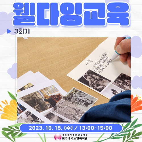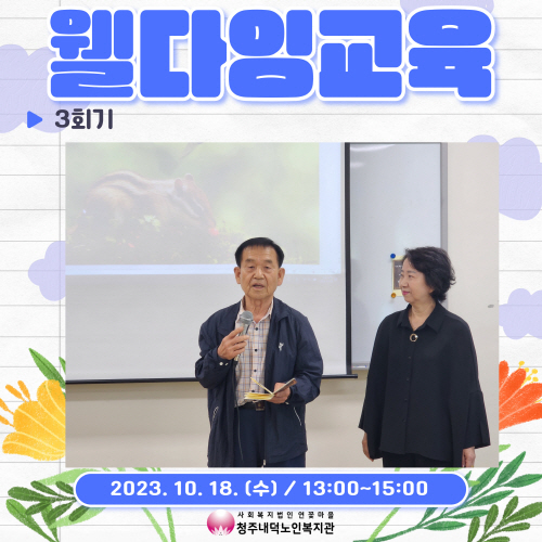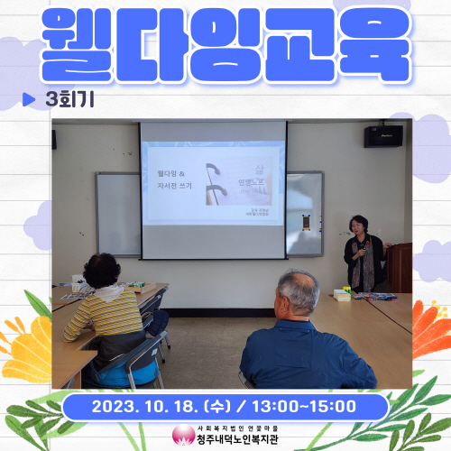 청주내덕노인복지관에서는 10월18일(수) 대한웰다잉협회와 연계한 웰다잉교육 집단상담 3회기가 진행되었습니다. 3회기 교육도 1회기와 2회기를 함께하였던 대한웰다잉협회 충남아산지부 지향순회장님의 강의로 진행되었습니다.