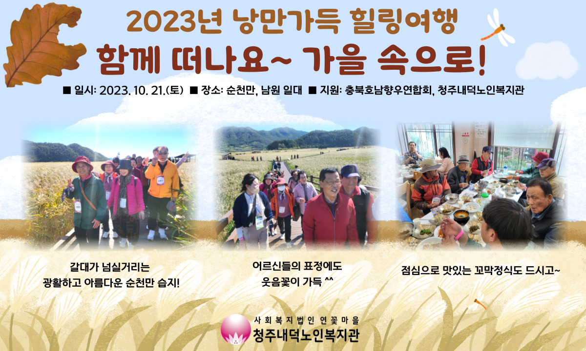 전라남도 순천과 남원 일대에 나들이를 다녀왔습니다. 이번 나들이는 충북호남향우연합회에서 관람료와 식사, 교통비 일체를 지원해주신 덕분에 어르신들께서 부담 없이 가을 나들이에 참여하실 수 있었습니다. 긴 여정에도 불구하고 어르신들께서는 바람 따라 일렁이는 순천만 갈대밭의 장관에 흠뻑 빠져보고, 순천만 국제정원박람회에서 다양한 국가별로 아름답게 조성해 놓은 정원들을 관람하며 남원 춘향테마파크와 광한루원에서 옛 정취를 만끽하시는 등, 오랜만에 동년배의 어르신들과 함께 떠난 가을 나들이에 매우 만족해하셨습니다. 앞으로도 청주내덕노인복지관은 지역사회의 여러 자원을 연계하여 어르신들께서 행복한 노후를 보내실 수 있도록 열심히 노력하겠습니다~!