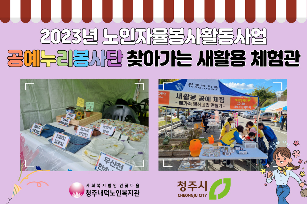 2023년 노인자율봉사활동사업 공예누리봉사단 '찾아가는 새활용 체험관'이 10월 15일(토), 10월 20일(금), 10월 27일(금)~28일(토) 총 4회 진행되었습니다. 10월 15일(토)는 '청원생명축제' 에서 '업싸이클링' 물품을 전시하며 지역주민에게 홍보하였습니다. 10월 20일(금)는 우리 복지관에서 진행하는 '늘벗골 나눔장터' 에서 체험부스를 운영하여 폐가죽 열쇠고리 만들기 체험 및 '업싸이클링' 물품을 전시하여 '늘벗골 나눔장터'에 참여하는 지역주민과 복지관 이용 어르신에게 홍보 및 체험의 기회를 제공하고 올바른 재활용 분리배출에 대하여 인식개선 조사를 실시 하였습니다. 10월 27일(금)~28일(토) '청주시 평생학습박람회' 부스운영을 통해, 체험부스(폐가죽 열쇠고리 만들기) '업싸이클' 물품전시, 올바른 재활용 분리배출에 대하여 인식개선 조사를 실시하여 지역주민에게 홍보를 진행하고 체험의 기회를 제공하는 시간을 가졌습니다.