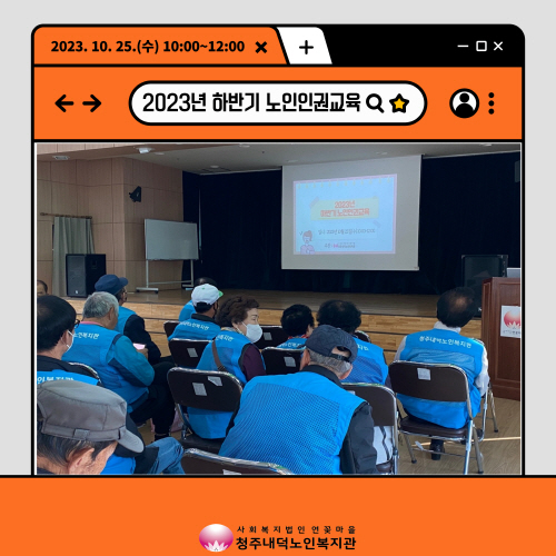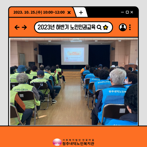 청주내덕노인복지관에서는 10월25일(수) 10시~12시까지 노인권익증진을 위한 2023년 하반기 노인인권교육을 실시하였습니다.