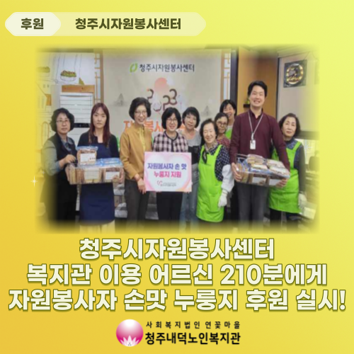 청주시자원봉사센터(센터장 김천식)에서 직접 만드신 누룽지가 왔어요! 자원봉사자 선생님들이 직접 만든 누룽지 210봉지를 복지관에 후원해주셨습니다!