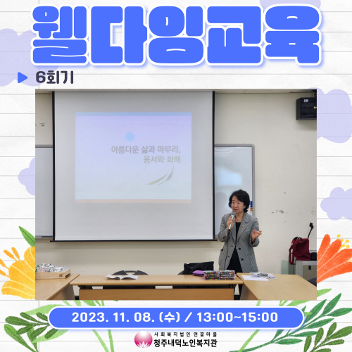 청주내덕노인복지관에서는 11월8일(수) 대한웰다잉협회 충남아산지부 지향순회장님과 함께 진행하는 웰다잉교육 집단상담 마지막 6회기가 진행되었습니다.