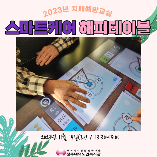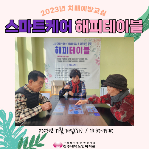 청주내덕노인복지관에서는 2023년 마지막 그룹으로 11월14일(화)에 치매예방교실 스마트케어 해피테이블 교실이 진행되었습니다.