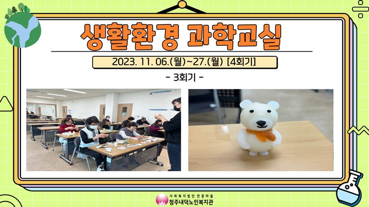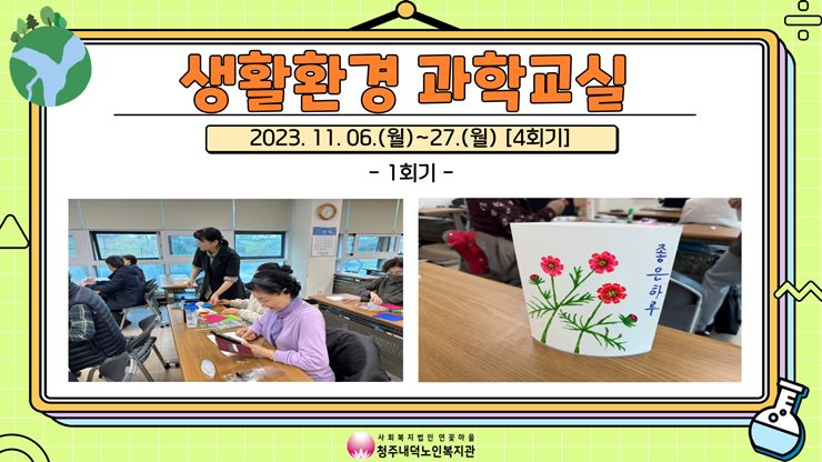 생활환경과학교실은 충북대학교 과학기술진흥센터와 연계하여 진행되었으며, 생활 속 과학과 최신 과학기술을 쉽고 재미있게 익히고, 지속가능한 환경보전의 필요성에 대한 인식을 제고할 수 있도록 하는 교육입니다. 교육에서 간단한 생활 속 과학 상식에 대한 지식을 배운 뒤 과학, 환경과 관련된 물품들을 만들어보았습니다. 4회기 동안 참여자들은 종이등, EM 주방세제, 주물럭 비누, 양초, 이끼액자를 만들어보았으며, 생활과 연관되어있지만 몰랐던 세제, 비누에 담긴 성분이나 공기정화식물에 대한 진실을 배워볼 수 있는 시간이었습니다. 앞으로도 이용자분들이 다양한 분야에서의 지식을 습득하고 경험 하실 수 있도록 노력하겠습니다!