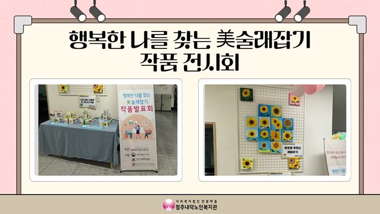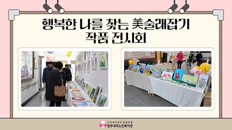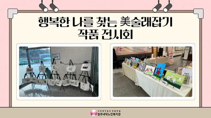 11월 23일(목)~ 11월 29일(수)의 기간 동안 복지관에서 문화예술교육지원사업 행복한 나를 찾는 미술래잡기 미술반 작품 전시회를 진행하였습니다. 수강생분들이 1년동안 만드신 다양한 작품들을 선보이셨으며 이용자분들은 수강생분들의 실력에 놀래시기도 하고 복지관이 화사해졌다고 말씀해주셨습니다. 일년동안 좋은 작품들이 나올 수 있도록 노력해준 강사님과 수강생분들께 감사드리며 미술반은 11월 30일에 마지막 수업을 가질 예정으로 서로의 작품 감상 및 일년동안의 소감을 나눠볼 예정입니다.