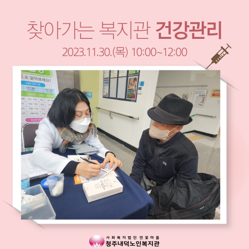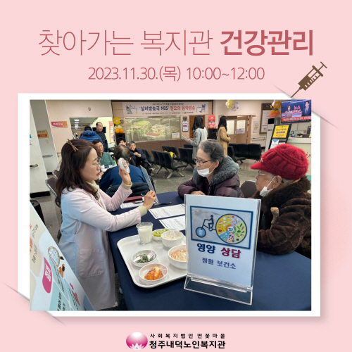 청주내덕노인복지관에서는 2023년 11월30일(목) 10시부터 12시까지 복지관 내 1층 로비에서 청원보건소와 함께하는 건강생활지원사업인 찾아가는 복지관 건강관리가 진행되었습니다.
