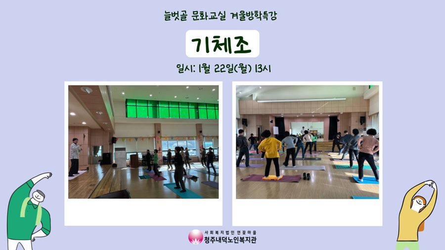 1월 22일(월) 13시에 1층 강당에서 늘벗골 문화교실 방학특강 기체조 2회기가 진행되었습니다. 기체조 강좌가 2024년 늘벗골 문화교실 신규 강좌로 편성되면서 어떤 강좌일지 궁금해하실분들을 위해 강사님이 맛보기 체험으로 구성해주셨습니다 저번 시간에 이어서 기체조에 대한 이론 설명을 한 후에 본 운동에 들어갔습니다. 참여자분들끼리 정답게 하는 인사부터 여러 동작들, 호흡, 단전수련까지! 이번에도 유쾌한 강사님의 설명으로 화기애애한 분위기 속에 수업이 마무리 되었습니다. 늘벗골 문화교실 강좌에서는 맛보기 강좌에서 설명 못드린 더 세부적인 내용과 동작들이 준비되어있다고 합니다 몸 튼튼, 마음 튼튼, 뇌 튼튼, 기체조 늘벗골 문화교실 정규 강좌도 기대해주세요!