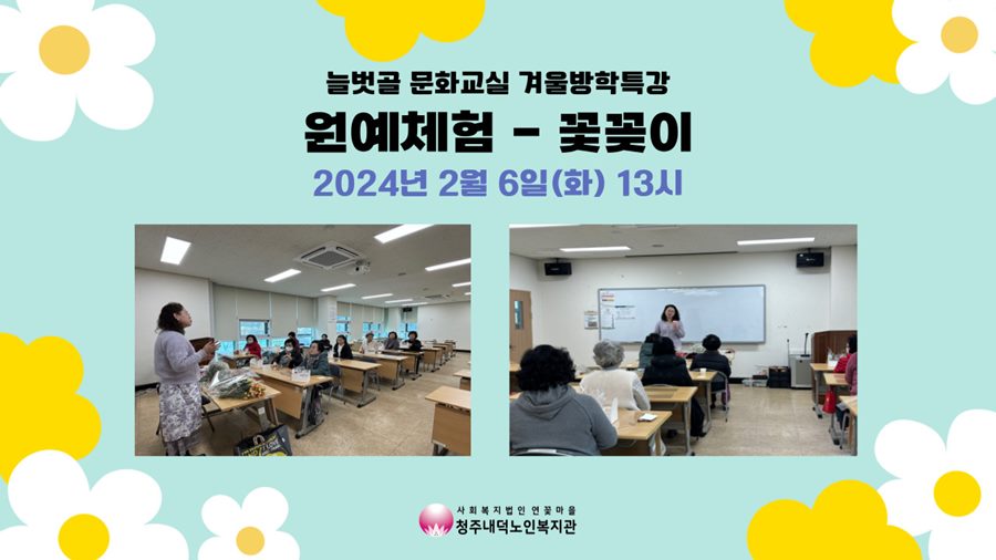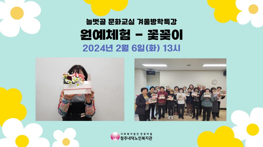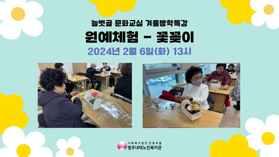 늘벗골 문화교실 겨울방학특강 원예체험 1회기가 진행되었습니다~ 예쁜 꽃들을 한아름 안고 수업을 진행하러 와주신 강사님의 소개를 시작으로 첫시간은 꽃꽂이 수업으로 진행되었습니다. 용돈 박스 등 다양한 용도로 쓰일 수 있는 상자에 참여자분들은 자유롭게 꽃을 배치하고 꾸미셨습니다. 높이도 생김새도 다양하여 완성되고보니 꽃 향기가 풀풀 ~ 마치 복지관이 화원이 된 것 같았습니다! 수업을 마무리 하기 전 마지막으로 강사님이 명절을 맞아 특별히 준비해주신 프리저브드를 활용한 용돈봉투 제작까지! 참여자분들은 꽃과 식물들로 힐링하는 기분으로 즐겁게 작품들을 만드셨고, 다가오는 설 명절 자녀나 손자녀들에게 본인이 만드신 작품을 선물해주고 싶다고 말씀하신 참여자분들도 계셨습니다. 겨울방학특강 원예체험은 총 3회기 진행 예정으로 다음주에는 수경식물을 활용하여 작품을 만들 예정이니 남은 수업도 많은 관심 부탁드립니다~