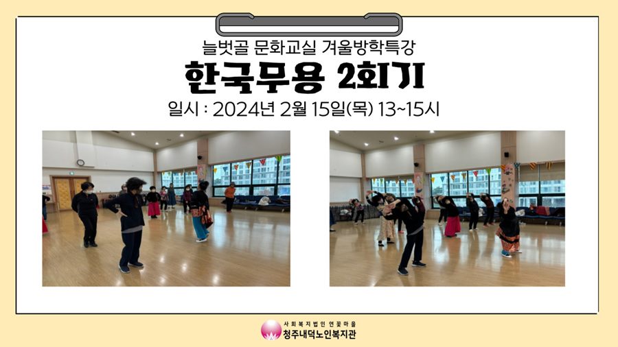 2월 15일(목) 13시 복지관 1층 강당에서 늘벗골 문화교실 겨울방학특강 한국무용 2회기가 진행되었습니다! 강사님과 함께 스트레칭으로 수업을 시작한 후 저번주에 배운 노들강변 1절을 복습한 후 이어서 2절 동작들을 배워보았습니다 2회기만에 한국무용 한 작품을 완성한 수강생분들은 몸도 풀리고 너무 재밌었고, 우리 음악과 우리 춤이 최고인 것 같다면서 만족스러워 하셨습니다. 짧은 기간에도 한국무용에 대해 열심히 강의를 지도해주신 강사님께 다시 한 번 감사드리고 앞으로도 특강으로 이용자분들이 다양한 경험을 해볼 수 있도록 노력하겠습니다!